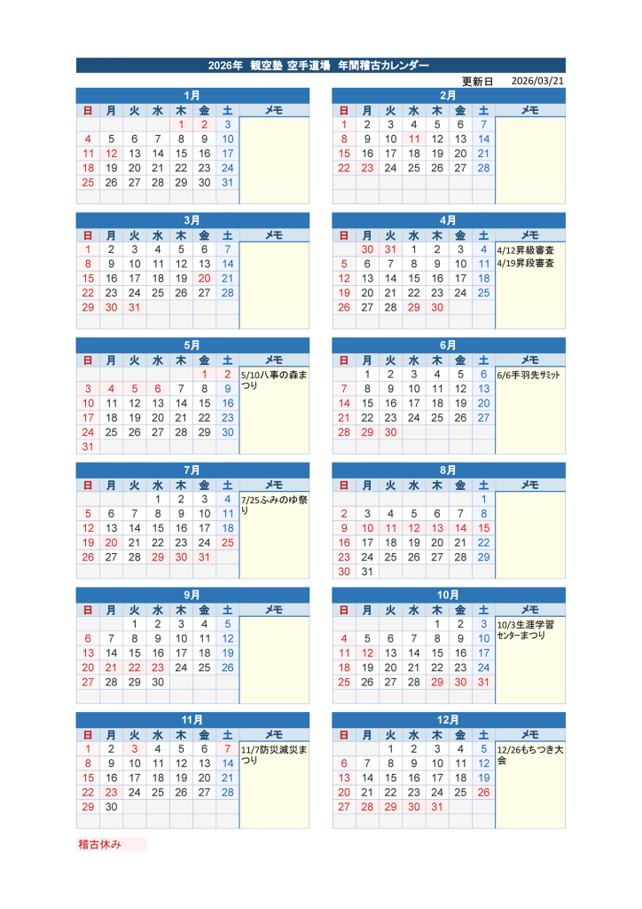 年間稽古日カレンダー