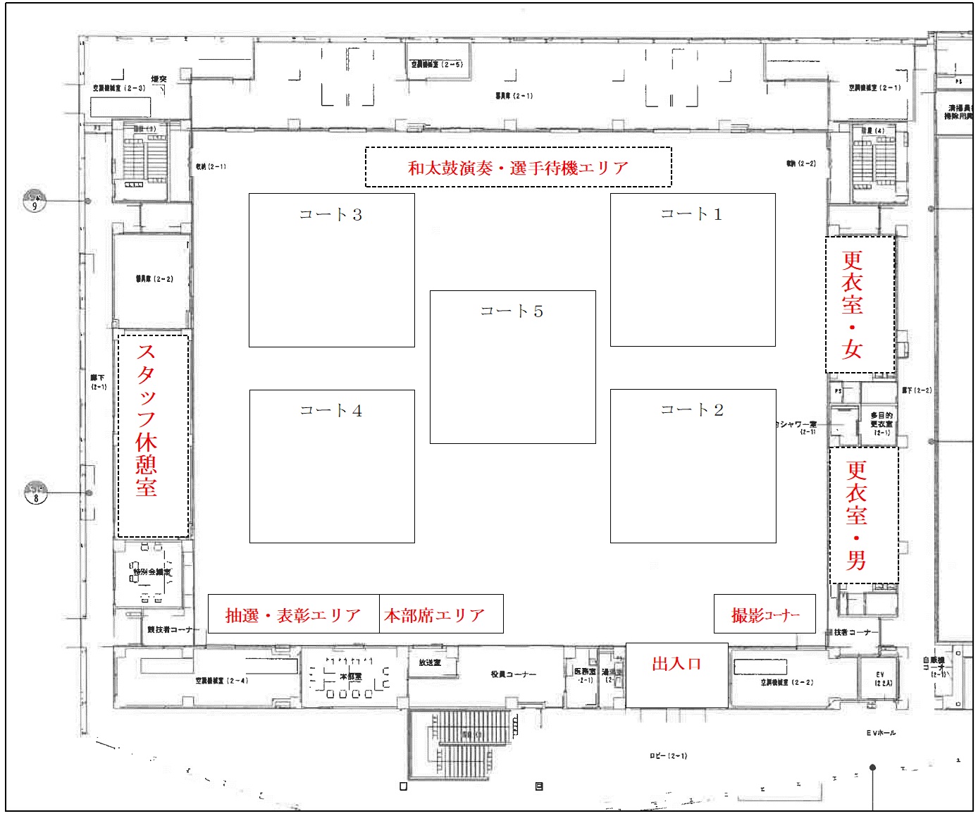 審判→タタミ1 スタッフ→タタミ2 - 8:30 アリーナ開場